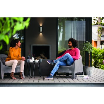 De Buxus wandlamp van MyGarden by Philips is gemaakt uit roestvrij staal en voorziet je buitenmuren van mooi licht. Zowel langs beneden als langs boven. De afgeronde wandlamp beschikt over 2 geïntegreerde leds van 4,5 watt en een hoog IP-niveau (nl. IP44). Die waarde geeft aan dat deze spatwaterdichte buitenverlichting best tegen een stootje kan! Meer nog: je kan de lichtintensiteit van deze lamp zelfs aanpassen aan met een dimmer (niet meegeleverd). Zo kan je een bepaald object accentueren of de sfeer aanpassen aan elke gelegenheid. Wat dacht je van een romantisch diner voor twee ... of toch liever een gezellige avond met familie en vrienden?