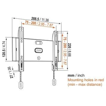 Deze vaste TV steun komt slechts 2,7 cm van de wand. De TV steun is geschikt voor platte LCD en LED beeldschermen van 48 cm tot 109 cm of van 19 tot 43 inch. Deze maten worden diagonaal gemeten. Het maximale gewicht van de TV is 20 kg. Met deze TV steunen worden alle bevestigingsmaterialen meegeleverd. De maximale bevestigingsmaten van de TV zijn 200 x 200mm.