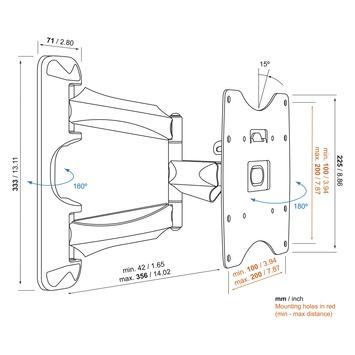 Deze draai- en kantelbare TV steun komt slechts 4,2 cm van de wand. Deze TV steun is geschikt voor een platte LCD, LED en Plasma TV van 48cm tot 94cm of van 19" tot 37". Deze maten worden diagonaal gemeten. Het maximale gewicht van de TV is 20 kg. Met deze TV steunen worden alle bevestigingsmaterialen meegeleverd. De maximale bevestigingsmaten van de TV zijn 200 x 200mm.