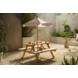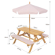 Met deze tafel maak je eenvoudig een gezellige speel- of eethoek in de tuin, op het balkon of op het terras. Het formaat is perfect afgestemd op jonge kinderen en geeft volop ruimte voor creativiteit en plezier. De tafel wordt geleverd met een parasol en kussens, zodat ze comfortabel en beschermd tegen de zon kunnen zitten.