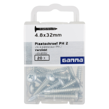 Met Gamma plaatschroeven met boorpunt bevestigd u eenvoudig harde plaatmaterialen en plastic panelen op houten delen. Deze 4,8X32 verzinkt plaatschroef heeft een cilinderkop voor een eenvoudige bevestiging. Plaatschroeven met boorpunt worden ook Zelfborende Plaatschroeven en boorschroeven genoemt.