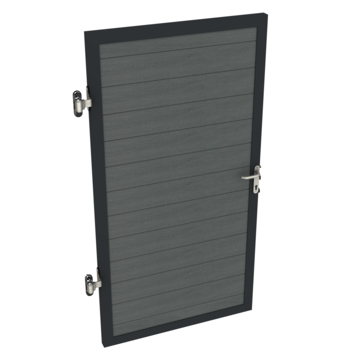 Plastivan poort Duofuse HKC kunststof graphite black is een tuinpoort die gemaakt is van hoogwaardig composiet kunststof. Met een hoogte van 180 cm en een breedte van 102 cm biedt deze poort een stevige afscherming voor je terrein. De poort heeft een moderne uitstraling in graphite black en is onderhoudsarm. Dankzij het gebruik van HKC kunststof is de poort bestand tegen weersinvloeden en gaat deze lang mee, zonder dat je hoeft te schuren of te schilderen.