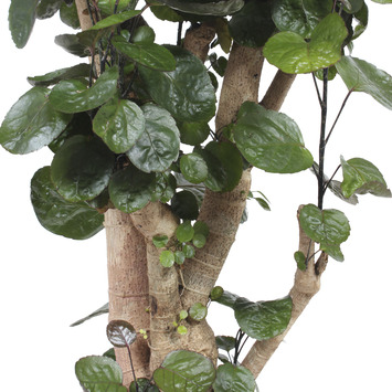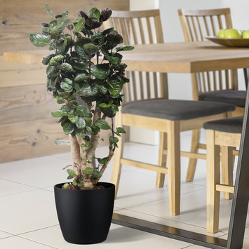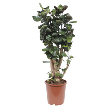De Polyscias Fabian is een dwergboom met een uitbundig uiterlijk. Deze variant is 70 centimeter hoog en heeft een potmaat van 27 centimeter. De plant heeft een stevige stam en zijn donkergroene bladeren hebben een bijna leerachtige textuur. De Polysias wordt regelmatig als bonsai gebruikt, omdat hij weer uitloopt op de stam bij het punt waar je het hebt afgeknipt. De Polyscias komt oorspronkelijk uit Taiwan. Polyscias betekent letterlijk 'veel schaduw' door de vele bladeren. Verzorgingstips voor Polyscias? De Polyscias is een plant die wel wat meer verzorging vraagt. De plant heeft veel zon nodig, of in ieder geval veel indirect licht. Laat de Polyscias 'wennen' aan het zonlicht door hem telkens dichterbij het raam te zetten. Houd de grond goed vochtig. In de winter mag het wat minder, maar zorg dat de grond niet uitdroogt. Controleer daarom regelmatig de grond en geef liever kleine beetjes water dan in één keer tegelijk. Wees voorzichtig met kalkrijk kraanwater, hier kan de Polyscias niet zo goed tegen. Door de plant regelmatig te sproeien, voorkom je bruine randen aan de bladeren. Daarbij helpt regelmatig sproeien goed tegen stof en luis.