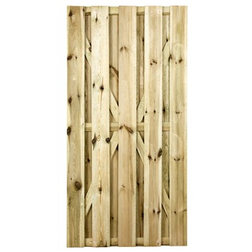 Deze poort past perfect bij de schutting uit dezelfde serie: Solid. Hiermee maak je jouw tuinafscherming helemaal af! De tuindeur is gemaakt van geïmpregneerd geschaafd grenenhout. Door het impregneren is de poort beschermd tegen houtrot. Het is wel te adviseren het hout na 5 jaar te behandelen met een tuinbeits. De tuindeur bestaat uit 9 planken van ca. 13,5 cm breed en ca. 1,3 cm dik. De planken zijn bevestigd door middel van spijkers. De poort heeft, net zoals de schutting, een levensduur van ongeveer 10 jaar en gemiddelde privacy. De poort heeft een standaard breedte van ca. 90 cm en een hoogte van ca. 180 cm. Deze tuindeur kan zowel links- als rechtsdraaiend worden geplaatst. Bevestigingsmateriaal dient los te worden aangeschaft.