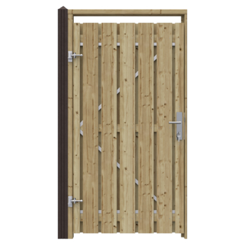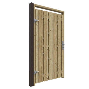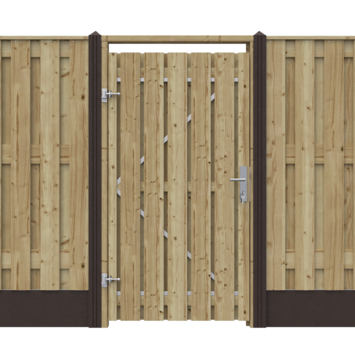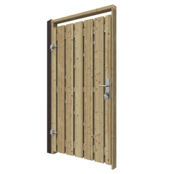 Dit pakket is bijbehorend aan de Houtbeton tuinschermen Vuren. De totale breedte van het poortpakket is ± 107 cm inclusief een extra betonnen paal en kozijn. De breedte kan iets korter of langer zijn afhankelijk van de werking van het hout en de bevestigingsmethode. Hiermee dient rekening gehouden te worden bij het plaatsen van de schutting.Het pakket bestaat uit de volgende onderdelen: