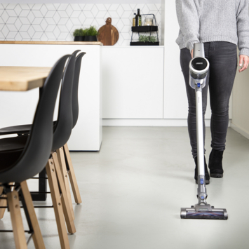 - Geen gedoe met snoeren of stofzakken, maar geheel draadloos en makkelijk manoeuvreerbaar over harde vloeren en tapijt