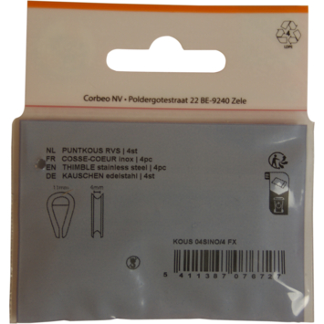Een puntkous is erg handig voor het maken van een lus aan het uiteinde van een koord of kabel. Deze puntkous 4mm RVS 4 stuks is gemaakt van roestvaststaal wat corrosie nagenoeg voorkomt. Naast het creëren van een lus, helpt dit hulpmiddel om een koord te beschermen tegen doorsplijten wanneer er vaak wrijving mee is. Op deze manier kun je langer gebruikmaken van je koord. Vaak wordt een puntkous gecombineerd met een draadklem, waarmee je eenvoudig koorden en kabels blokkeert of vastzet. Deze puntkous wordt verkocht per set van 4 stuks. Kortom: voorkom splijtend draad met deze puntkous.