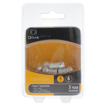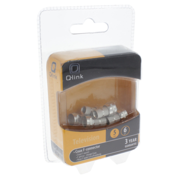 Coaxkabels sluit je met behulp van de Q-link F-connector eenvoudig aan op schotels, versterkers of splitters. Met de F-connector realiseer je een directe aansluiting van de kabel. Dankzij deze directverbinding wordt het signaalverlies van radio of televisie aanzienlijk beperkt. De F-connectors van Q-link worden geleverd per 6 stuks en schermen af tegen stoorsignalen. Je gebruikt deze F-connector voor coaxkabels van 5mm.