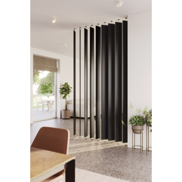 Soms hebben we geen nood aan meer ruimte, maar wensen we de huidige ruimte beter of optimaler te benutten. Op een éénvoudige manier, door gebruik te maken van een roomdivider, kan bv. een "home office" of een leeshoek gecreëerd worden binnen de bestaande woonruimte. Onze lamellen zijn éénvoudig te plaatsen en geschikt voor een plafondhoogte tussen 2,44 en 2,54 meter. Verkrijgbaar in de kleuren wit, zwart of licht eiken. Zie de handleiding voor instructies over hoe de roomdivider gemonteerd moet worden.