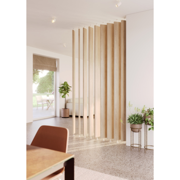 Een trendy afscheiding maken in je woning was nog nooit zo eenvoudig. Met deze draaibare lamellen maak je een afscheidingswand die makkelijk te monteren is. Na montage kun je de lamellen verdraaien naar eigen wens. Deze roomdivider is verkrijgbaar in 3 kleuren: zwart, wit en eik en bestaat ook in ellipsvormige variant.