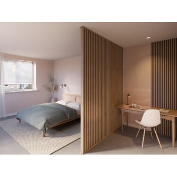 Een roomdivider bestaat uit drie onderdelen: spijlen, profielen en montagetape. De profielen zijn nodig om de spijlen te bevestigen en vormen het raamwerk van de wand. Door de spijlen in de uitsparingen van de profielen te plaatsen, krijg je een stevige constructie zonder zichtbare schroeven of klemmen. Deze rechte uitvoering zorgt ervoor dat de lamellen haaks op de vloer staan en geeft zo een rustige, evenwichtige uitstraling aan je interieur.