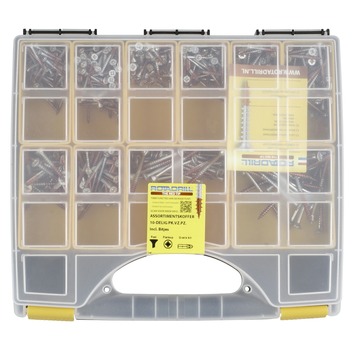 Een breed assortiment Rotadrill® verzinkte Universeelschroeven met een platkop en Pozi-aandrijving en Nylon pluggen, verpakt in een handige transparante kunststof 13-vaks assortimentkoffer met uitneembare bakjes. De rode punt aan de Rotadrill® schroeven is een gepatenteerd smeermiddel dat er voor zorgt dat de schroeven zeer licht indraaien voor optimaal schroefgemak. Hierdoor zijn de schroeven zeer gemakkelijk te verwerken in verschillende bouwstoffen. In de assortibox worden de bijpassendes bitjes gratis meegeleverd.