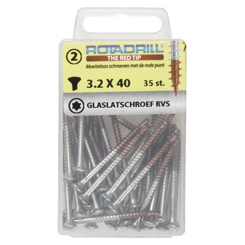 Rotadrill® Glaslatschroeven zijn hele dunne schroefjes met boorpunt gemaakt van speciaal gehard inox-410. Met deze schroeven kun je probleemloos glaslatten en andere latjes of plinten vastschroeven, zelfs zonder voorboren. De speciale boorpunt voorkomt hierbij het splijten van het hout. Het kleine lenskopje met freesribben onder de kop zorgt voor een mooie afwerking. De Torx aandrijving zorgt voor meer grip en een optimale krachtoverbrenging. De rode punt aan de Rotadrill® schroeven is een gepatenteerd smeermiddel dat er voor zorgt dat de schroeven zeer licht indraaien voor optimaal schroefgemak. Geleverd in een stevige kunststof bewaarverpakking.