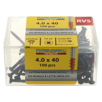 Zoek je een goede schroef die bij je lattenwand voor buiten of ander tuinhout kunt gebruiken? Ga dan voor de Rotadrill lattenwandschroef torx rvs-410 4.0x40 mm 100 stuks. Deze schroef heeft een zwarte lenskop en verzinkt dus mooi in de zwarte latten van de lattenwand of in zweeds rabat. De schroef heeft een torxkop van het type T20. Je kunt hem dus met een torx-bitje of schroevendraaier indraaien. Er zit een gratis bitje in het doosje!