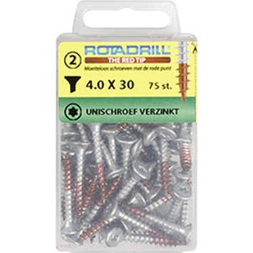 Rotadrill® Universeelschroeven Platkop Verzinkt Torx zijn bedoeld voor gebruik binnenshuis in hout of in een plug. Met de Torx-schroeven heb je veel meer grip door de optimale krachtoverbrenging van het bitje op de schroef. Hierdoor kun je gemakkelijk schroeven. De rode punt aan de Rotadrill® schroeven is een gepatenteerd smeermiddel dat er voor zorgt dat de schroeven zeer licht indraaien voor optimaal schroefgemak. Hierdoor zijn de schroeven zeer gemakkelijk te verwerken in verschillende bouwstoffen. De platverzonken kop verzinkt netjes in het hout bij het aanschroeven en is bedoeld voor hout-op-hout verbindingen. Geleverd in een stevige kunststof bewaarverpakking.
