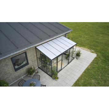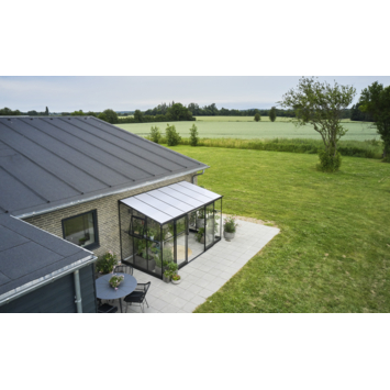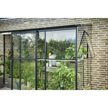 De Qube Lean-To 126 is een praktische muurkas met zeer fraaie uitstraling. Het gehele kasframe wordt samengesteld uit één aluminium vierkant (Qube) profiel. Het veiligheidsglas wordt vastgezet met tape en dubbele beglazingsstrip. Het dak van de kas is voorzien van 6 mm dik opaal polycarbonaat wat een isolerende functie heeft en prettig diffuus licht in de muurkas geeft. Deze kas heeft een 80 mm brede goot aan de voorzijde welke voorzien is van aansluitstukken voor een regenpijp. Als accessoire is een regenpijpset Ø 40 mm (tot op het maaiveld) leverbaar. De dubbele schuifdeur met handgreep is 184 cm hoog en voorzien van een telescopische deurrail. De drempel is zeer laag waardoor de kas goed toegankelijk is. De Qube Lean-To 126 is standaard voorzien van een zwarte coating. De nokbalk, goten en optionele fundering worden geleverd in meerdere koppelbare delen. Voor alle modellen van de Qube is optioneel een zwart gecoate kweektafel leverbaar. Deze tafels zijn ca. 60 cm breed en loopt over de lengte van de zijgevel van de kas.
