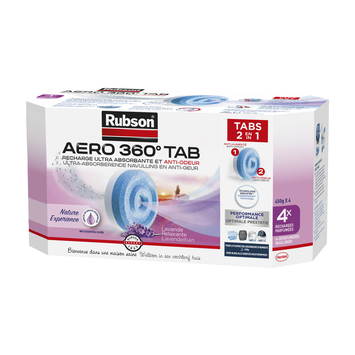 Rubson maakt coatings, kitten en schuim onder hetzelfde mom: elk product overwint vocht! Afhankelijk van de functie, het materiaal en de ondergrond kies je voor een van de vele producten uit het ruime gamma. Rubson Vochtopnemer Aero 360° optimaliseert de luchtcirculatie met 360°. Het unieke systeem is gebaseerd op een fysisch principe: hoe meer contact met de lucht, des te hoger de vochtopname. Bijgevolg zorgt het aerodynamische systeem voor een superieure vochtopname en een zeer efficiënte geurneutralisatie in (te) vochtige ruimtes. Het systeem is verkrijgbaar met neutrale - of lavendeltabs.