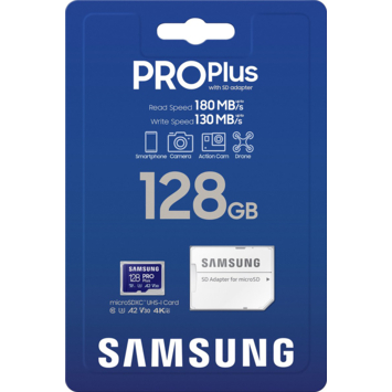 De Samsung PRO Plus Micro SD Geheugenkaart inclusief Micro SD adapter biedt een opslagcapaciteit van 128 GB. Met lees- en schrijfsnelheden tot 180/130MB/s en een UHS-1 interface, kun je snel bestanden overdragen. Deze geheugenkaart is onder andere geschikt voor Android-smartphones, tablets, actiecamera's, drones en gameconsoles.