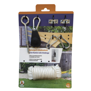 Set met de nodige elementen om een schaduwdoek of schaduwzeil te bevestigen, inclusief installatie stappenplan met foto's. Uniek en eenvoudig spansysteem: eindeloze spanmogelijkheden door het gebruik van touw en een katrolsysteem. Gemakkelijk weg te nemen, bvb. in de winter om op te bergen of op momenten dat er geen extra schaduw nodig is. Geschikt voor de bevestiging van een driehoekzeil.