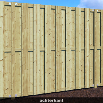 Schutting Jumbo is gemaakt van 15 geschaafde grenen planken. De planken zijn bevestigd met behulp van geschoten schroeven. Het grenenhout waar de schutting uit bestaat is geïmpregneerd en daardoor beter bestand tegen weersomstandigheden. Schutting Jumbo is 1,80 m hoog en 1,80 m breed. De afzonderlijke planken zijn 13,5 cm breed en 1,3 cm dik. Deze schutting heeft een levensduur van wel 10 jaar en kan na 5 jaar behandeld worden met een tuinbeits als bescherming voor het hout. De natuurlijke eigenschap van hout zorgt verder voor demping van het geluid.