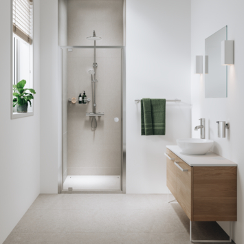 De Sealskin Seev Draaideur is een slimme keuze voor een nis van 76-80 cm of om te combineren met een zijwand. Het solide raamwerk zorgt ervoor dat jouw doucheruimte waterdicht blijft, en de deur heeft een uniek scharnierontwerp dat ruimtebesparend is. De deur scharniert niet direct vanaf de muur, maar iets daarvandaan, waardoor je minder ruimte nodig hebt voor de open draaiende deur. Dit resulteert in ongeveer 15 cm ruimte tussen de deur en de muur, wat handig is als je bijvoorbeeld een haakje of een radiator in die ruimte wilt plaatsen.