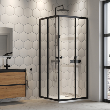 Zoek je een praktische en flexibele doucheoplossing? De Sealskin Hooked vierdelige hoekinstap met schuifdeuren in mat zwart biedt maximale functionaliteit. Het 6 mm gehard veiligheidsglas met antikalklaag blijft langer helder en maakt onderhoud eenvoudig. Dankzij het vierdelige schuifsysteem openen en sluiten de deuren soepel, zelfs in kleinere badkamers, zonder extra ruimte in te nemen.