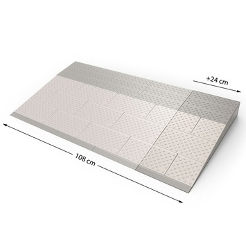 De SecuCare 4-laags drempelhulpverbreder maakt het betreden van bredere deuropeningen en schuifpuien eenvoudiger. Deze verbindingsset vergroot de standaard drempelhulp van 84 cm naar 108 cm, waardoor er meer ruimte ontstaat voor het gebruik van een rollator, rolstoel of scootmobiel. De hoogte van 4 cm zorgt voor een geleidelijke overgang bij het passeren van een drempel. De set is eenvoudig te plaatsen en geschikt voor situaties waar extra breedte gewenst is.