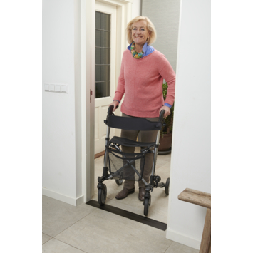 Mooie platte drempel verlager, de rollator gaat er met vollekopjes koffie probleemloos overhen