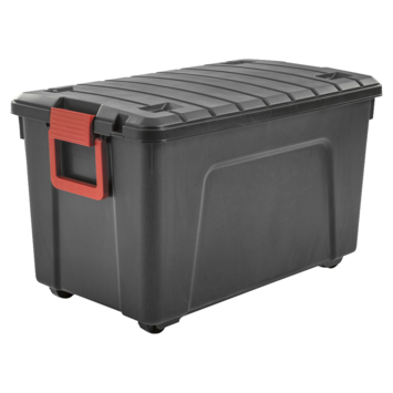 De Sia opbergbox (110 liter) van Keter is een stevige opbergdoos op wieltjes gemaakt uit kunststof in de kleur zwart. De rechthoekige opbergbox is afgewerkt met rode hengsels / handvaten en een stevig deksel. Dankzij de wieltjes kan je deze compacte opbergbox makkelijk verplaatsen. Goed om te weten: de Sia opbergbox met een inhoud van 110 liter is ook verkrijgbaar met een inhoud van 75 liter. Ideaal om klusgerei, speelhoed, winterkledij, ... in op te bergen.