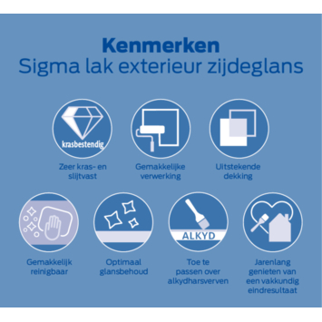 Jarenlang genieten van een vakkundig eindresultaat? Sigma Exterieur aflak (RAL 9010, 2,5 liter) is een hoogwaardige zijdeglans lak op basis van alkydhars, dus geschikt voor buitengebruik. De lak beschermt al je houtwerk, zoals ramen, deuren en kozijnen. Daarnaast is deze lak ook geschikt voor het aflakken van voorbehandelde metalen en kunststoffen. Gebruik voor een professioneel resultaat Sigma Primer Exterieur als voorbehandeling. Sigma Exterieur lak kun je het beste met een kwast of viltroller aanbrengen. Gebruik voor een profesioneel resultaat hierbij ook de Sigma Primer Exterieur Wit.