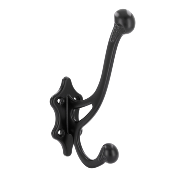 Deze ophanghaak bestaat uit twee delen waar een jas, tas of ochtendjas aangehangen kan worden. Met meerdere haken kunt u zelf uw kapstok samenstellen. De haak is gemaakt van ijzer en afgewerkt in de kleur zwart.