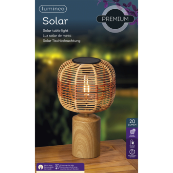 De Lumineo solar tafellamp geeft warm wit licht. Deze lamp is een sfeervolle aanwinst aan je tuin, balkon of terras. Het gerecycleerde wickermateriaal in warme natureltinten zorgt voor een natuurlijke en stijlvolle uitstraling, terwijl solar energie zorgt voor eenvoudig gebruik zonder gedoe met kabels. De lamp is uitgerust met twee filament LED's met warm wit licht die tot 8 uur branden en zo een uitnodigende sfeer creëren.