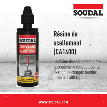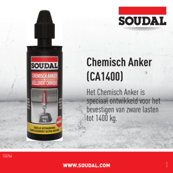 Bevestig zware objecten met Soudal chemisch anker. De super sterke lijm is ideaal om bijvoorbeeld een TV, trapleuning, mast, zonwering, rolluiken en hangstoelen mee op te hangen. Het chemisch anker is speciaal ontwikkeld voor het bevestigen van zware lasten tot wel 1.400kg.