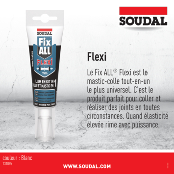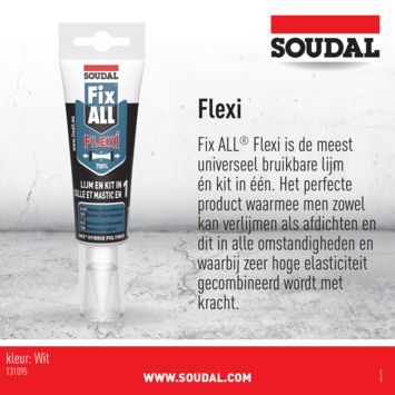 De meest universele alleskunner van Soudal is Fix All. Met deze lijmkit kan je alles afdichten en verlijmen. Maak je keuze uit Fix All Crystal, Flexi, High Tack of Turbo. Fix All Flexi in de kleur wit is de meest elastische lijmkit die er is. Het product is perfect voor het afdichten en monteren van verschillende bouwmaterialen op hout, kunsstof en metaal en in alle omstandigheden. Verkrijgbaar in en kleine tube (125 ml) zoals deze of een grotere kit.