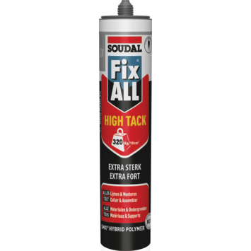 De meest universele alleskunner van Soudal is Fix All. Met deze lijmkit kan je alles afdichten en verlijmen. Maak je keuze uit Fix All Crystal, Flexi, High Tack of Turbo. Fix All High Tack is een extreem sterke lijmkit met een zeer hoge aanvangshechting. Het product is perfect voor het afdichten en monteren van verschillende zware bouwmaterialen op hout, kunststof en metaal in alle omstandigheden. Verkrijgbaar in verschillende kleuren zoals grijs.