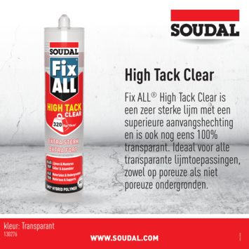 De meest universele alleskunner van Soudal is Fix All. Met deze lijmkit kan je alles afdichten en verlijmen. Maak je keuze uit Fix All Crystal, Flexi, High Tack of Turbo. Fix All High Tack is een extreem sterke lijmkit met een zeer hoge aanvangshechting. Het product is perfect voor het afdichten en monteren van verschillende zware bouwmaterialen op hout, kunststof en metaal in alle omstandigheden. Verkrijgbaar in verschillende kleuren zoals transparant.