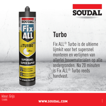Fix All Turbo is de meest veelzijdige lijmkit van Soudal en combineert kracht met snelheid. Je kunt hem gebruiken om allerlei bouwmaterialen te monteren of voegen af te dichten, zowel binnen als buiten. De sterke hechting en snelle krachtopbouw zorgen ervoor dat je zonder lange wachttijd verder kunt werken. Geschikt voor gebruik op glas, steen, hout, spaanplaat, metaal, keramische tegels, natuursteen, beton, pleisterwerk, kunststof (m.u.v. PE, PP en PTFE) en kurk. Dat maakt deze lijmkit handig voor wie efficiënt wil klussen zonder in te boeten aan kwaliteit of betrouwbaarheid.