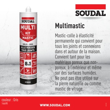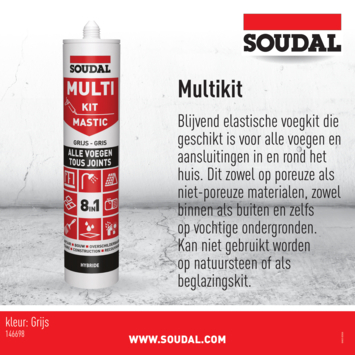 Multikit 8-in-1 grijsis een blijvend elastische voegkit die geschikt is voor alle voegen en aansluitingen in en rond het huis. Dit zowel op poreuze als niet-poreuze materialen, zowel binnen als buiten en zelfs op vochtige ondergronden.