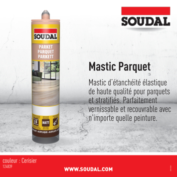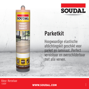De parketkit kerselaar (290 ml) van Soudal is een hoogwaardige elastische afdichtingskit geschikt voor parket en laminaat. Perfect vernisbaar en overschilderbaar met alle verven. Ook verkrijgbaar in andere kleuren en tinten.