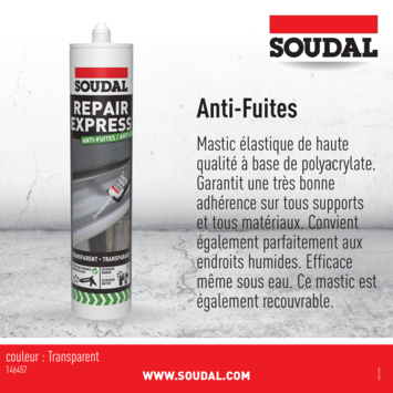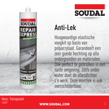 Soudal repair express dak transparant is een kit voor het herstellen en permanent waterdicht maken van scheuren en lekken in daken, goten, afvoerbuizen en koepels. Kan ook onder water gebruikt worden wat het ideaal maakt voor noodherstellingen, zelfs bij regenweer.