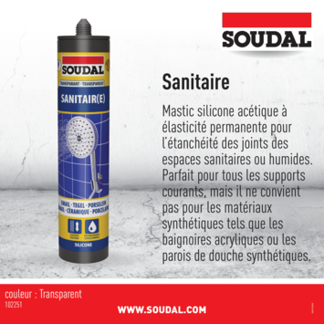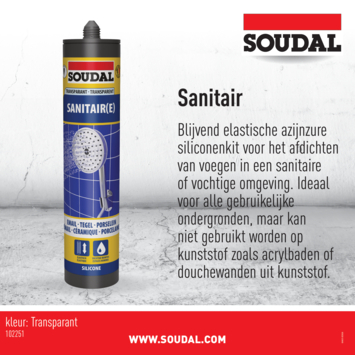 Soudal heeft afdichtingskitten en voegkitten voor elke klus in huis, zodat jij jouw huis kan perfectioneren. Gebruik Soudal Sanitair in vochtige omgevingen. Aangezien het een azijnzuurhoudende voegkit is, kan het niet gebruikt worden op kunststof. De transparante voegkit geeft geen vlekvorming en is niet overschilderbaar. Ook verkrijgbaar in wit.