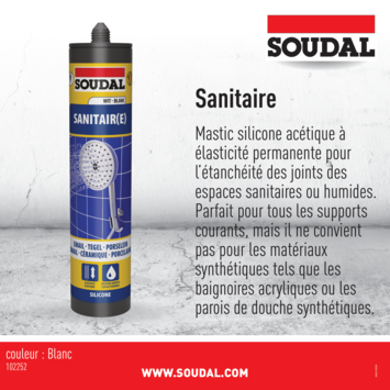 Soudal heeft afdichtingskitten en voegkitten voor elke klus in huis, zodat jij jouw huis kan perfectioneren. Gebruik Soudal Sanitair in vochtige omgevingen. Aangezien het een azijnzuurhoudende voegkit is, kan het niet gebruikt worden op kunststof. De witte voegkit geeft geen vlekvorming en is niet overschilderbaar. Ook transparant verkrijgbaar.