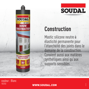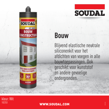 Soudal heeft afdichtingskitten en voegkitten voor elke klus in huis, zodat jij jouw huis kan perfectioneren. Soudal Bouw is een elastische bouw siliconenkit die geschikt is voor kunststof en gevoelige materialen of ondergronden. De siliconenkit is niet overschilderbaar. Verkrijgbaar in verschillende kleuren zoals wit.