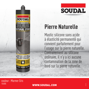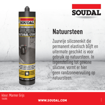 Soudal heeft afdichtingskitten en voegkitten voor elke klus in huis, zodat jij jouw huis kan perfectioneren. Soudal Natuursteen is een zuurvrije siliconenkit die permanent elastisch blijft. Uitermate geschikt voor natuursteen, marmer, graniet, ... en alle soorten beglazing en bouwvoegen. Veroorzaakt geen vlekvorming en is niet overschilderbaar.