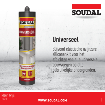 Soudal heeft afdichtingskitten en voegkitten voor elke klus in huis, zodat jij jouw huis kan perfectioneren. Gebruik Soudal Universeel voor universele bouwtoepassingen. De siliconenkit is geschikt is voor binnen en buiten voegen, maar net geschikt voor kunststof ondergronden noch overschilderbaar. Wel: zeer elastisch, temperatuur- en UV-bestendig. Verkrijgbaar in verschillende kleuren zoals grijs.
