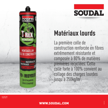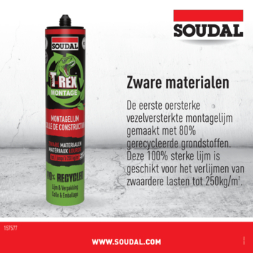 Soudal T-rex Green montagelijm zware materialen 350 gr is de eerste supersterke vezelversterkte montagelijm gemaakt van 80% gerecycleerde grondstoffen. De 100% sterke lijm is geschikt voor het verlijmen van zware bouwmaterialen en belastbaar tot 250kg/m².