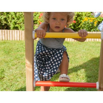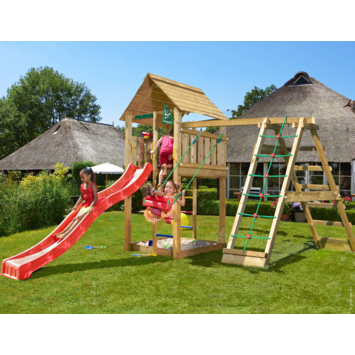Als je van klimmen en klauteren houdt is dit speeltoestel perfect met een spannende grote klimmuur en aan de andere kant een groot klimnet. Schommelen kan ook, wat wil je nog meer! Met een tijdloos houten dak geïnspireerd op de blokhutten in Scandinavische bergbossen, telescoop, kleurrijke klimladders aan de voor- en achterkant, lange glijbaan met optionele wateraansluiting, en zandbak.