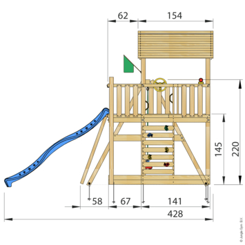 Stimuleer de verbeelding van je kinderen met dit complete speeltoestel voor urenlang buitenplezier. Met een schommelzitje, een lange glijbaan, een zandbak, een klimwand met grote klimgrepen, een trapje, een telescoop en een stuur is er altijd iets nieuws te ontdekken. Geschikt voor kinderen van 3-10 jaar. Jungle Gym speeltoestellen worden al 30 jaar ontworpen en geproduceerd in Nederland en staan bekend om hun topkwaliteit. Veiligheid staat bij ons voorop. Al onze producten ondergaan uitgebreide tests en voldoen aan de nieuwste Europese veiligheidsnormen (EN 71). Onze materialen zijn van hoge kwaliteit, weerbestendig, praktisch onderhoudsvrij en kindveilig zonder toxische stoffen en allergenen. Laat je kinderen zorgeloos spelen en ontdekken in hun eigen avontuurlijke tuinwereld.