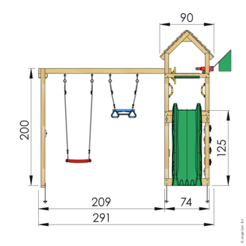 Speeltoestel Jungle Gym Cocoon grenen geïmpregneerd met glijbaan donker groen en 2-schommel module