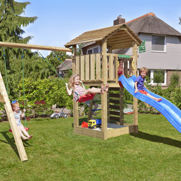 Speeltoestel Jungle Gym Cottage grenen geïmpregneerd met glijbaan blauw en 2-schommel module